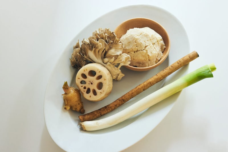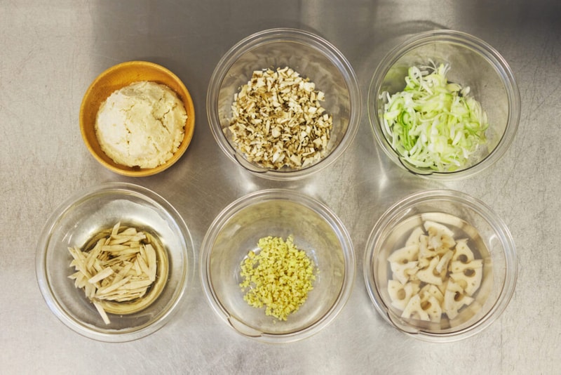まずは食材をカットしていきます。生姜、舞茸はみじん切り、ごぼうと長ねぎは斜め薄切り、そして蓮根は小さめの一口大にいちょう切り。少し大きい蓮根が食感のアクセントになります。ごぼうはカットしたら水に浸けてアクを抜いてくださいね。