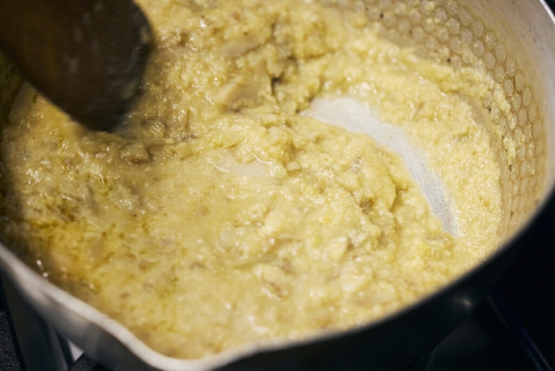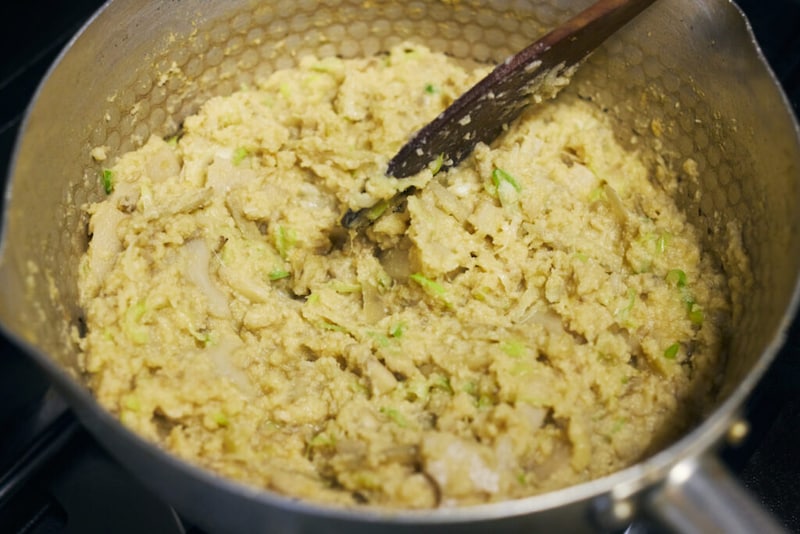 ここに主役のおからと出汁、醤油、みりん、砂糖、塩、そして米油を投入します。しっとりの秘密はこの米油。使用するおからによってしっとり感が異なるので、適宜調整してください。