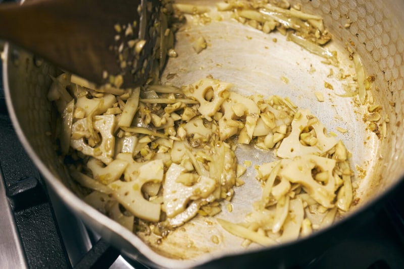 鍋にごま油を入れて、中火で生姜を炒めます。香りが立ってきたら、ごぼうと蓮根を加えて引き続き炒めてください。ここで野菜ときのこの出汁が出ますので、じっくりと。この出汁がごはんに合うんです……!