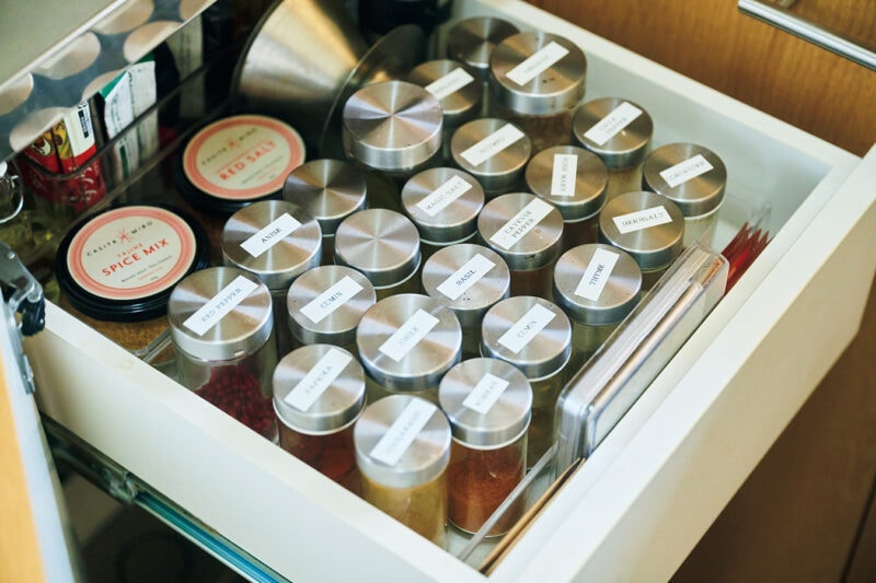 たくさんのスパイスは、ラベリングした容器に移し替えてコンロ横の引き出しに。「瞬時に探せて取り出せます」