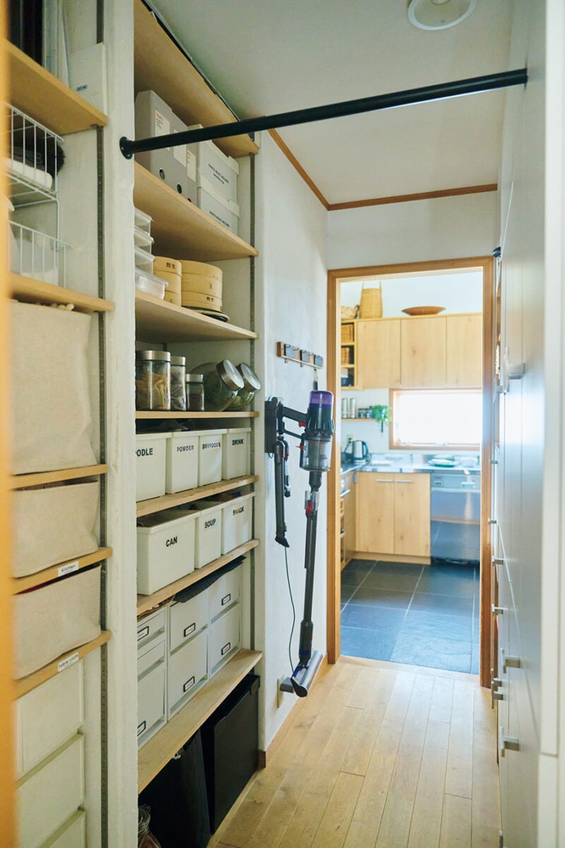 キッチンと洗面所をラクに行き来できるため、キッチン側には鍋などの調理道具、洗面所側には洗濯掃除用品をグラデーションで配置。