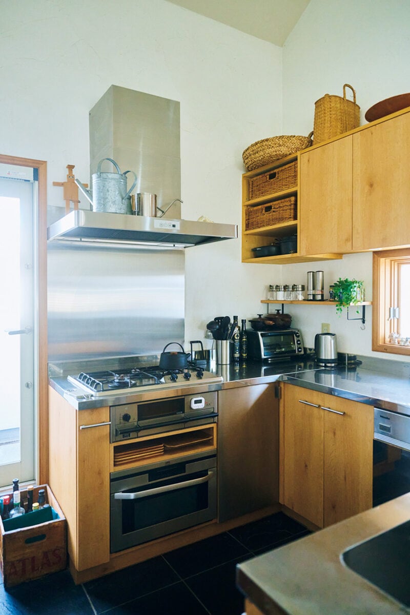 家のベースは白壁と木材。台所はステンレスと黒のスチール素材が加わるため、ごちゃつかないように他の色素材は排除。