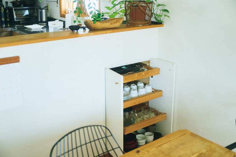 「お客様が来たとき、台所に行かずにカップやソーサーを取り出せるように、引き出しを作ってもらいました」