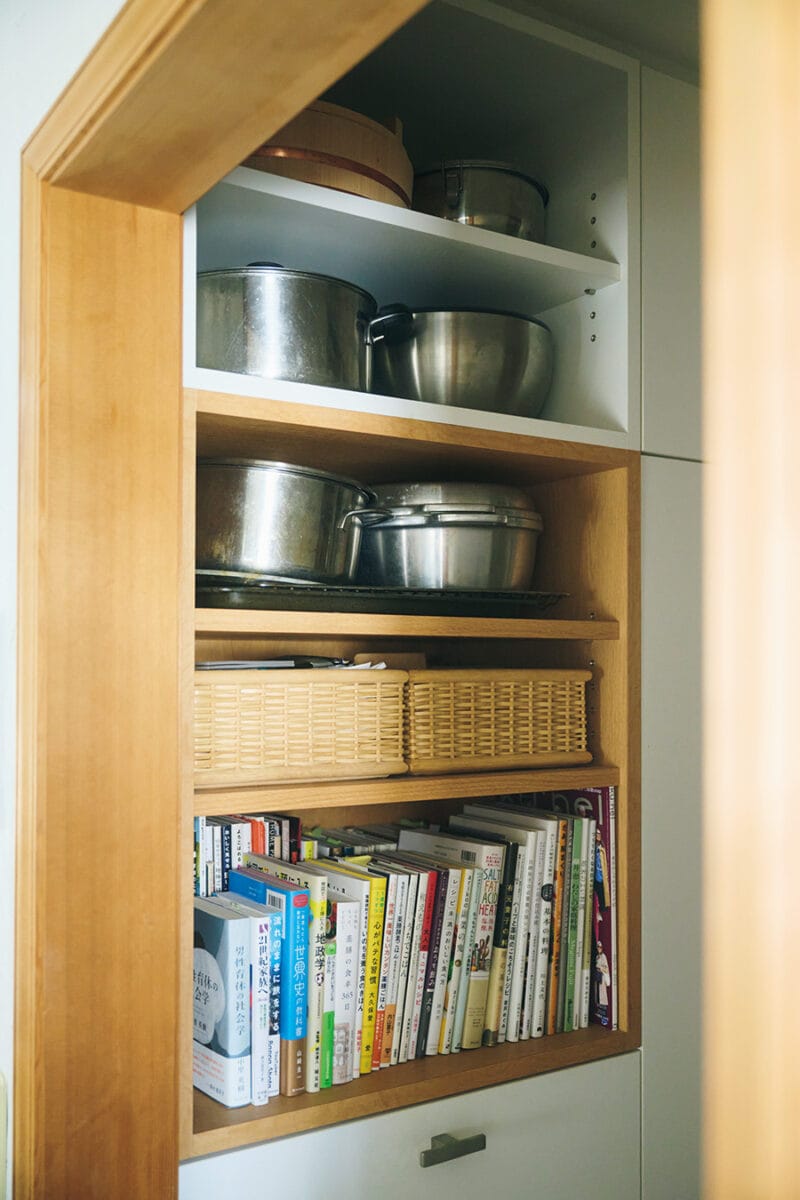 キッチンに近い棚には、鍋と料理本を収納。