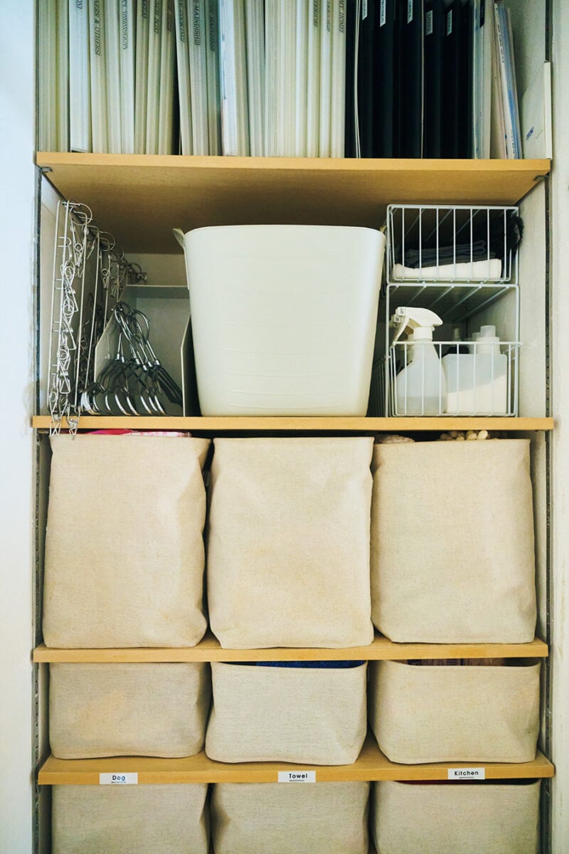 無印良品のボックスを使った目隠収納で、棚にラベリング。家族が定位置を覚えたら外します。