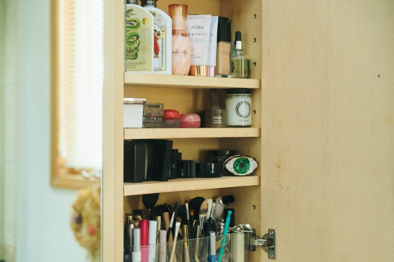 鈴木さんのメイク用品は倒れないようにクリア容器に立てて収納。