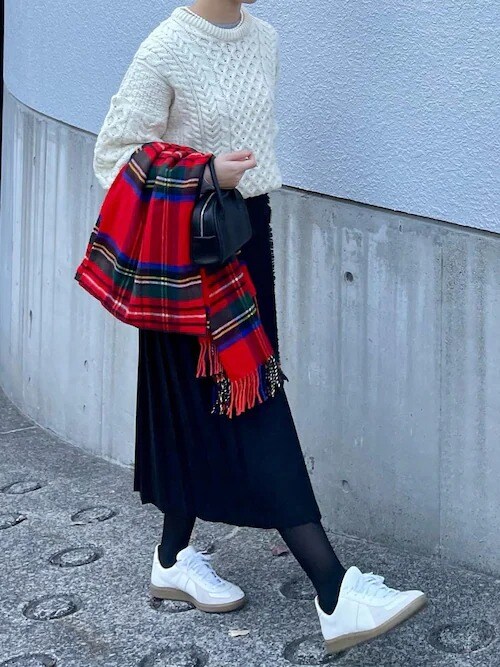 タータンチェック柄なら定番感があり、赤も派手になりすぎず上品に楽しめます。少し大判のサイズを選べば、首に巻くだけでなく肩にかけてストール風にも使えて便利。