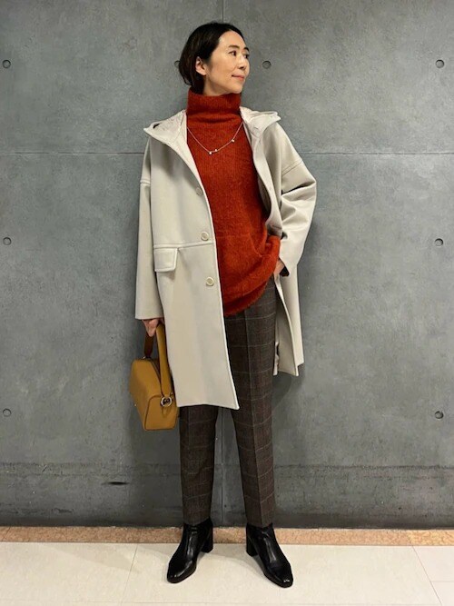 タートルニットで赤系カラーを取り入れると、首元からさりげなく色がのぞき、上品なアクセントに。