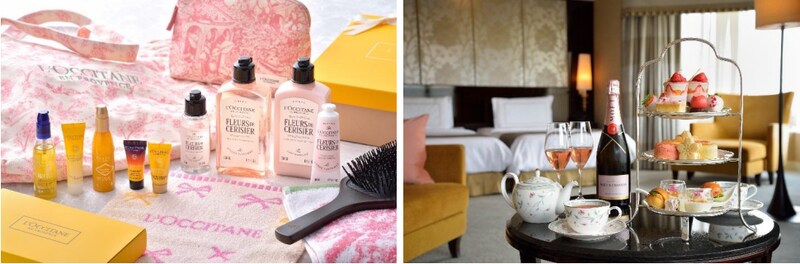部屋で楽しむアフタヌーンティー、スパ施設の利用(プール・温泉・フィットネスジム)、L'OCCITANE バスアメニティ 計5点、L'OCCITANE 桜香るギフトコレクション(1人1セット)などが付いて、1室2名時の料金は269,400円(消費税・サービス料込み、宿泊税別)からです。