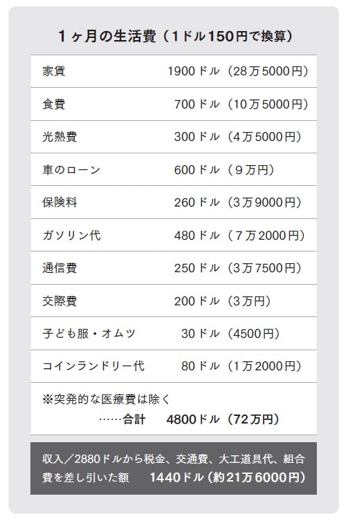 [図表1]1ヶ月の生活費(1ドル150円で換算) 出所:『底辺の大工、ヤバいアメリカで生きのびる 絶望の中で見つけた「自分を見失わない」方法』(KADOKAWA)