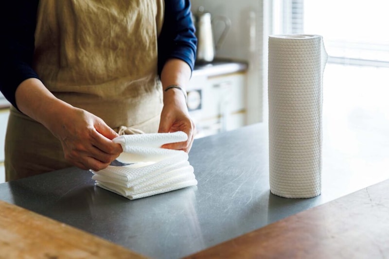 布のような丈夫さと、紙の吸水性を併せ持つペーパータオル。使い捨てと思いがちなアイテムを繰り返し使えて経済的。〝拭く〞行為のすべてを請け負ってくれる。70カット1 ロール¥493*編集部調べ(日本製紙クレシア www.crecia.co.jp)