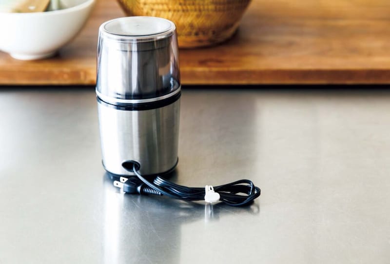 小さい家電をけっこう持っていて、この〈クイジナート〉のグラインダーもすごく使い勝手がいいんです。なので登場することが多いのですが、片付けるときにコードが整っていないと嫌なんです。〈無印良品〉のバンドはコード類をまとめるのに機能的。くるくるっと巻いて輪っかに引っ掛けるだけ。シンプルで落ち着いた色なのも台所に馴染みます。