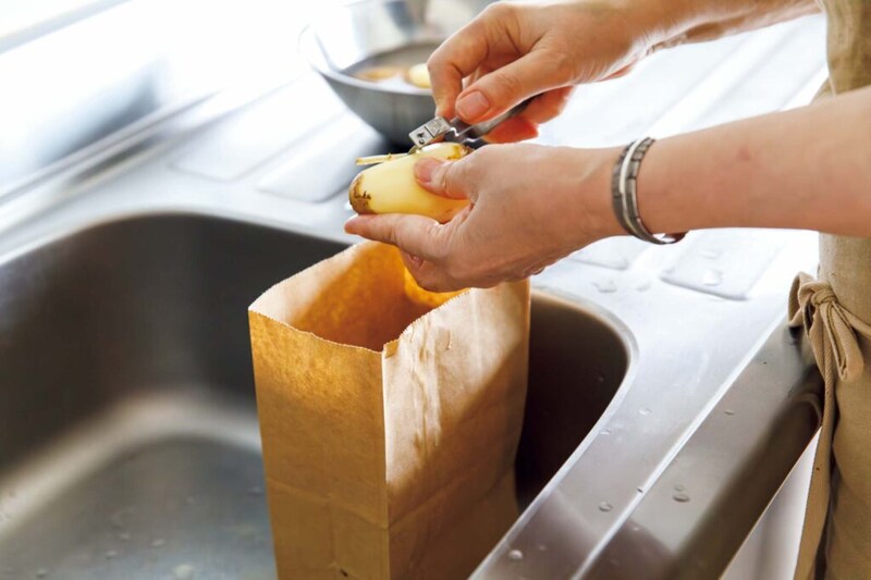 生ゴミを入れる水切り袋って野菜の絵などの柄がついていることが多いじゃないですか。何も描かれていない無地のものをさんざん探して、こちらになったという感じです。じゃがいもなどの皮剥きはもうこの上で直接、やってしまいます。野菜の皮やヘタなどいっぱいまで入れず、半分くらい溜まったら閉じて、防臭袋に入れてゴミ箱に捨てます。