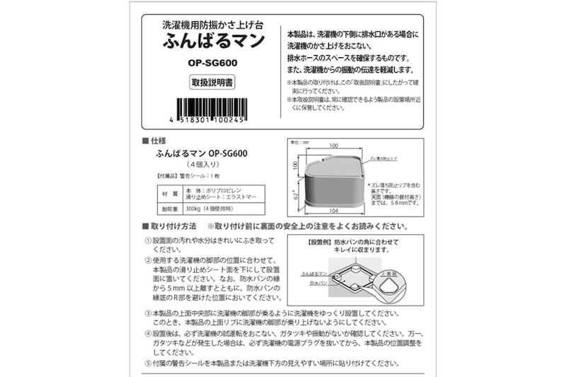 この防振かさ上げ台は、洗濯機の脚の下に設置するだけで、振動と音をしっかり抑えてくれるのが特長です。