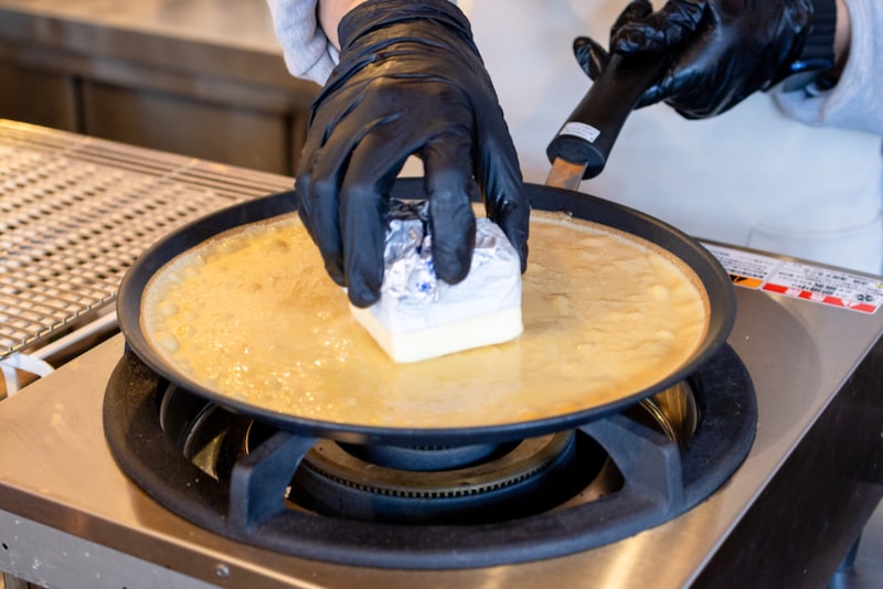 こちらのメニューは、安納芋の焼き芋ペーストとキャラメリゼされた紅玉にたっぷりのバターとシナモンが入ったホットクレープ。そして皿盛りにすることで、熱々のクレープの上にひんやり冷たいこだわりのチャイのアイスを乗せることも可能に。見た目も味も豪華になった、冬の特別感を演出します。チャイアイスとシナモンのスパイスさが安納芋とりんごの甘さを引き立たせ、キャラメルの香ばしさでさらに食欲を掻き立てます。