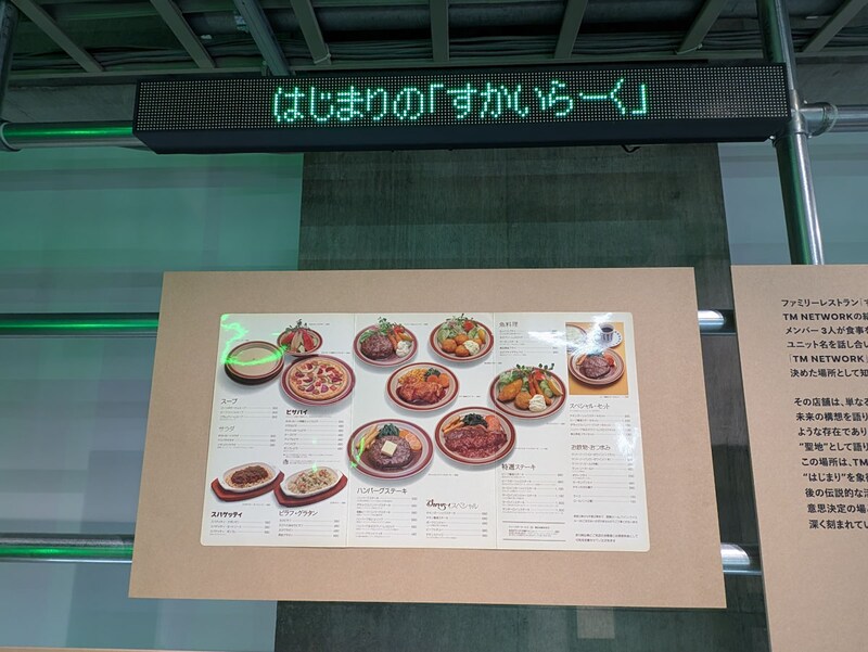 展示と並んで注目したいのが、地下3階『1/2(Nibun no Ichi)』で提供中のコラボメニューです。TM NETWORKのバンド名が誕生した場所であり、ファンにとって“聖地”とされる「すかいらーく」1号店での思い出の味をリプロダクションした2品を含め、全6メニューを食べられます。
