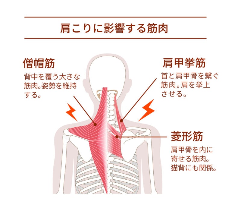 首から背中にかけては複数の筋肉があります。肩こりに影響する主な筋肉は「僧帽筋(そうぼうきん)」「肩甲挙筋(けんこうきょきん)」「菱形筋(りょうけいきん)」で、これらはすべて肩甲骨につながっています。