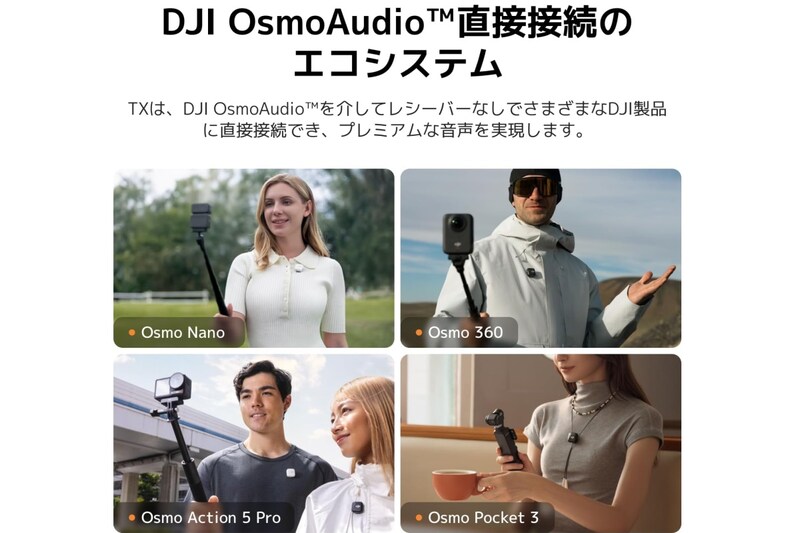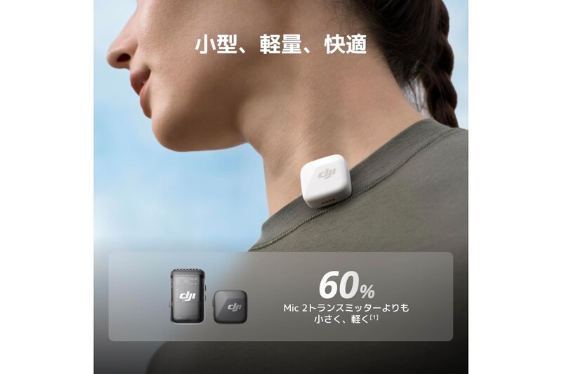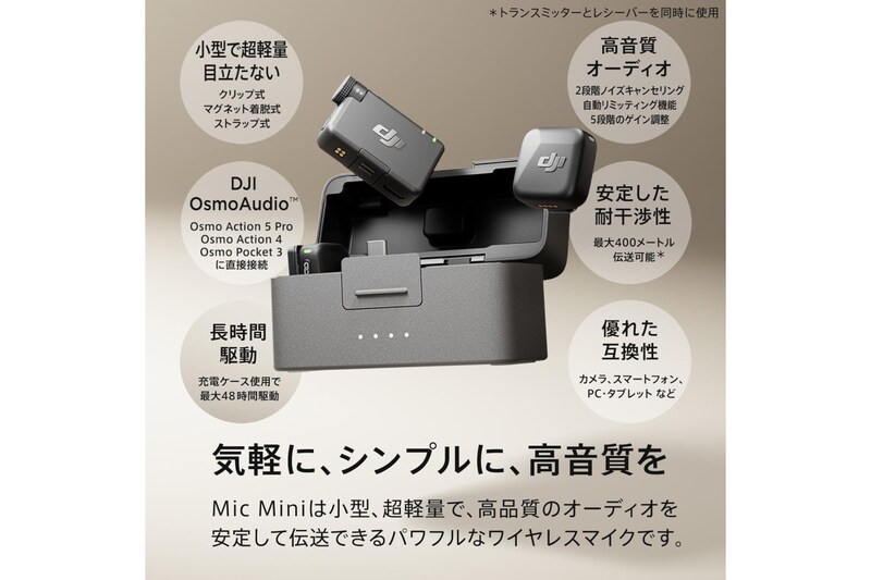 手のひらに収まるコンパクトなサイズながら、安定した音声伝送とノイズキャンセリング機能を備えており、屋外撮影や人の多い場所でも声をクリアに拾ってくれます。