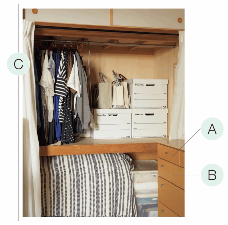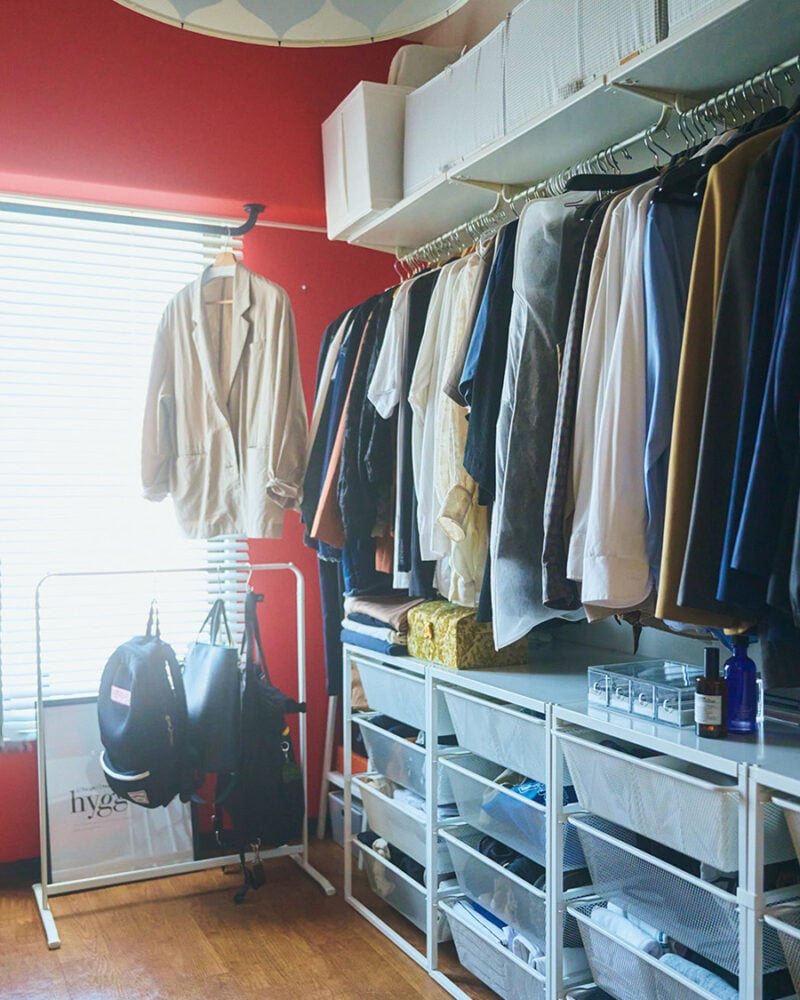 「スタメンと控えが混ざっていると、着たい服を見つけづらく、出し入れもしにくいんです」。控えはクリーニング預けにしたり、ボックスに収めて上部の棚へ。出番の少ないハレの日用の服は、衣装カバーに入れて仕舞うことでホコリから守れて、さらに“スタメン”に意識を集中できると言います。