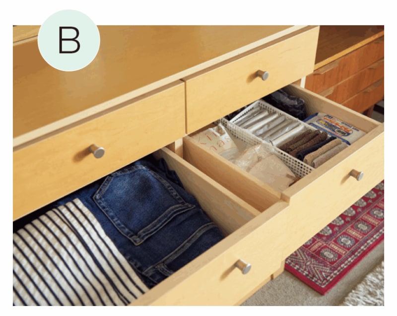 クローゼット横にある箪笥の、上の引き出しにはTシャツ、中央は予備の靴下、右はハンカチ類。