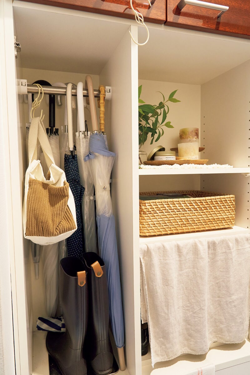 隠したいものは籠に入れ、左側には傘とレインブーツを収納。