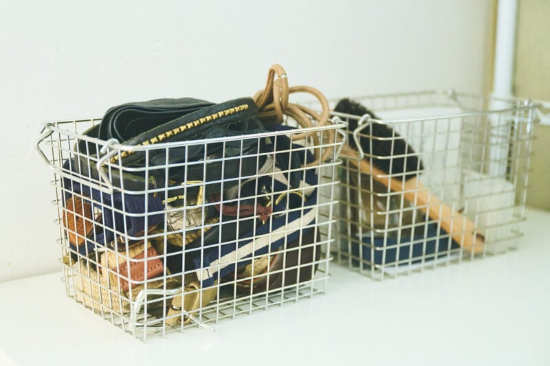 ベルトは吊るすと取りにくさを感じていたので、丸めてスチールのメッシュかごに収納。