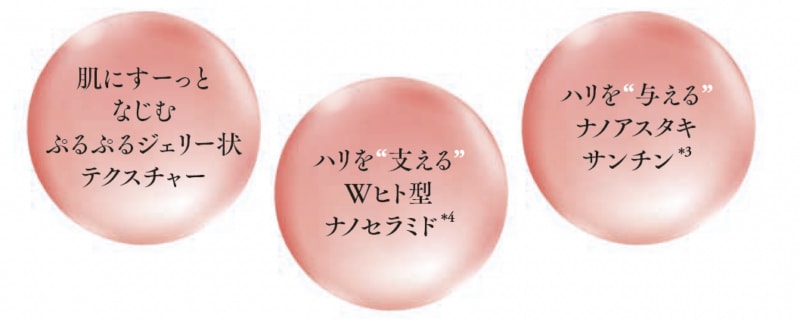 さらにハリ肌を支える2種類の「セラミド」を世界最小クラス*8まで極小化した「Wヒト型ナノセラミド*4」を、ぷるぷるのジェリー状のテクスチャーにすることで高濃度な状態で届けて*7います。