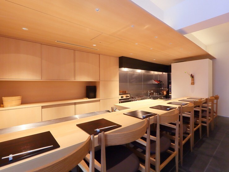 柔らかい間接照明に照らされた店内は、白木のカウンター7席とテーブル席の個室が1つというこぢんまりとした心地よい空間。カウンター席では、目の前で職人技が堪能できます。日本酒は銘柄に定番をつくらず、常に新しい銘柄を吟味して追加や入れ替えを行うこだわりようです。