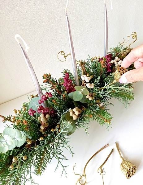 ベースの完成です。センターピースなので、360度どこから見てもいい雰囲気に作ります。モミに茶色い実が付いていてかわいかったので、それをトップに挿しました。
