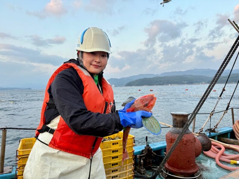 今回の“海の京都”旅は、京都府の海業振興事業のモニターツアーで訪れたのですが、宮津市の養老漁港では定置網漁も体験してきました! 私は漁船に乗ること自体が初めてだったので、ドキドキ。念のため酔い止めを飲んで臨みました。写真で私がおっかなびっくり手にしているのは「ホウボウ」です。熱帯魚のようにキレイですが、実は高級魚なんだとか。