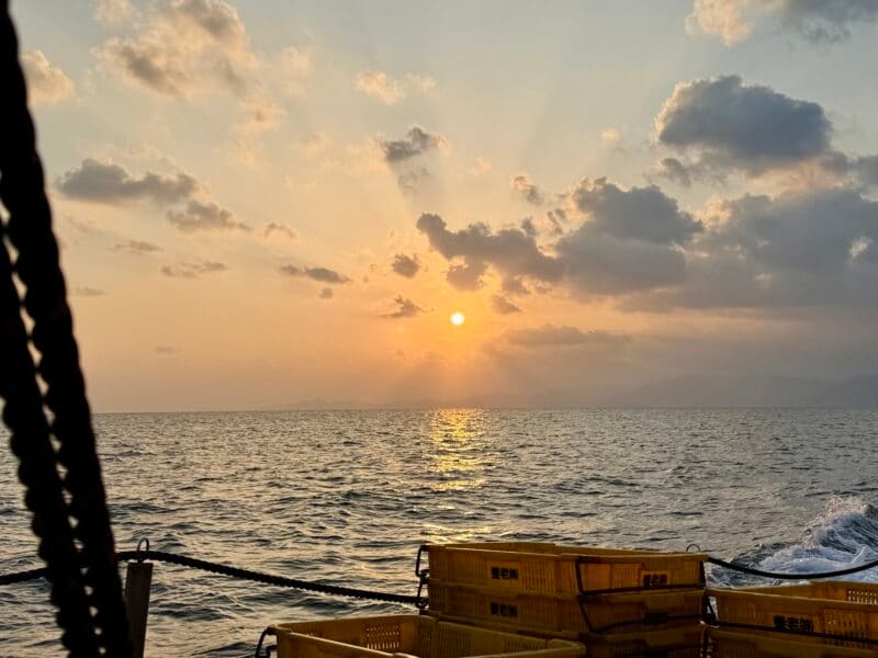 暗いうちに港を出て、船上にいる間に朝日が昇ってきました。私は基本インドア派なので、海の上で朝日を見ることがあるなんて! とてもいい経験になりました。ちなみに定置網体験は一般の方でも参加可能です。詳しくは、養老漁業さんの公式サイトへ。