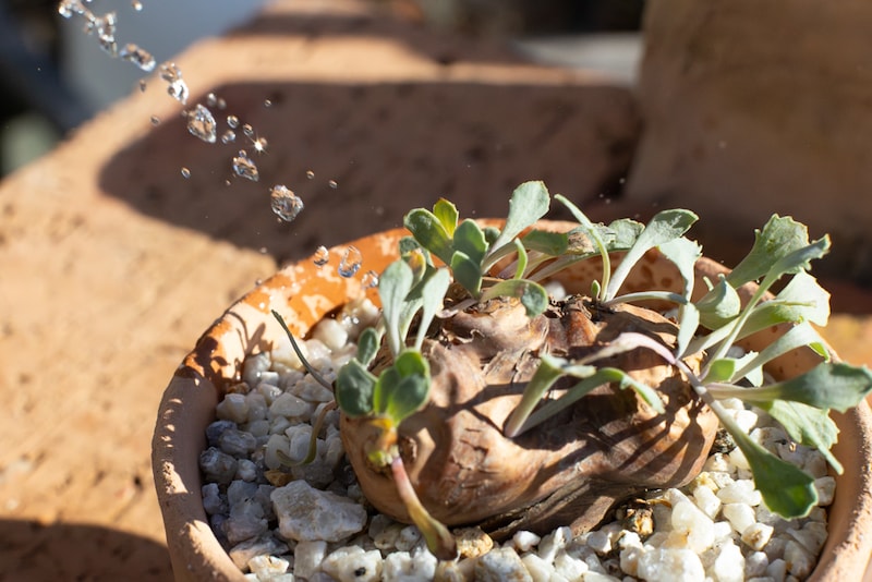 このため、株の防御力の弱まる休眠中は、屋内で丁寧に“眠っている我が子”を見守るように管理するのがベストですこうして夏を無事乗り切ったら、10月に入った頃に徐々に芽吹きはじめるので、緩やかなペースで灌水量を増やしていきます。