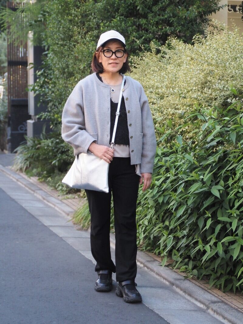 「モノトーンコーデが好きなので、グレーと黒の2色でまとめました」。キャップやスニーカーでカジュアルテイストに寄せつつも、とろみ素材のブラウスに2色買いした「iki」のビスチェを重ねることで、ほんのり女性らしいスタイリングに。「同系色だとレイヤードにも挑戦しやすいと思います」