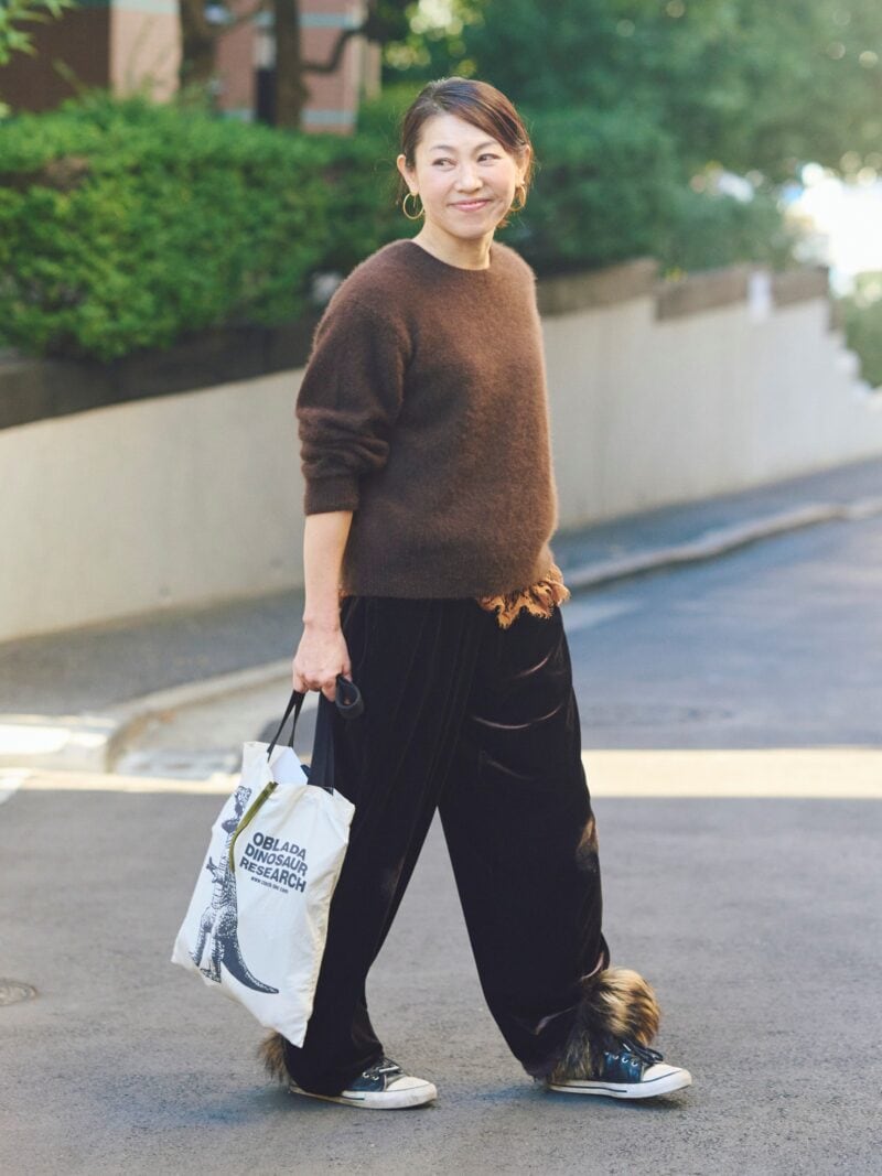 今季購入した「ユナイテッドアローズ」のニットと、「ジプソフィア」のキャミソールをレイヤード。ニットの裾からさりげなくレースをのぞかせることで、こなれ感が倍増! 「パンツはベロア素材のものを選び、素材の違いを楽しむスタイリングを意識してみました」。シンプルながら、奥行きを感じるおしゃれ上級者の装いです。