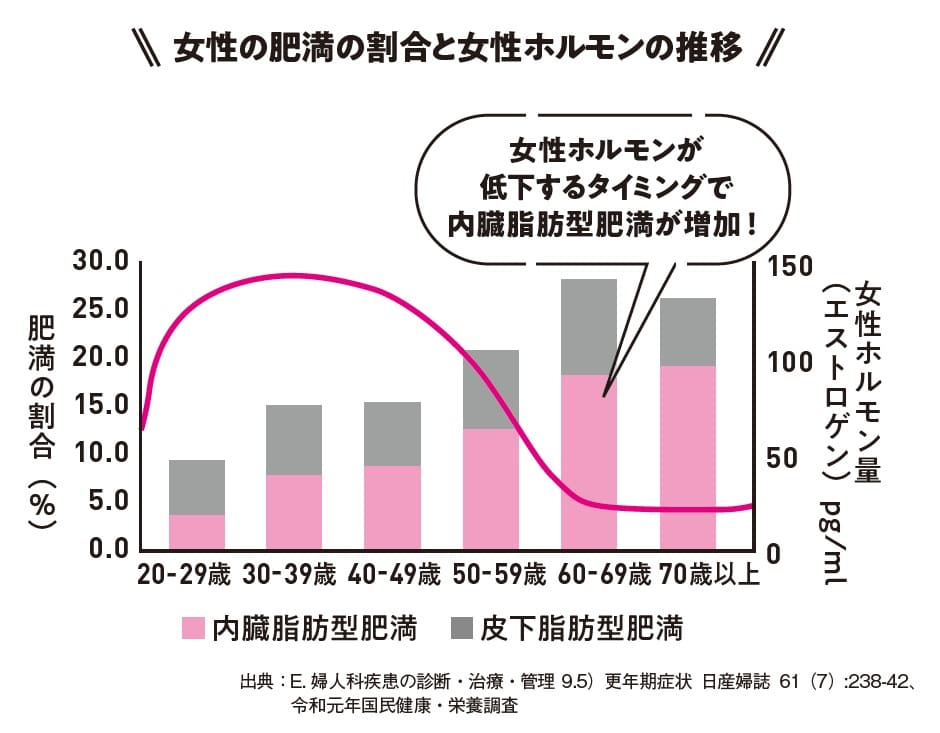 若いころと同じように食べすぎたり、運動不足だったりすれば、更年期以降は内臓脂肪がたまっていくのは自然の摂理。