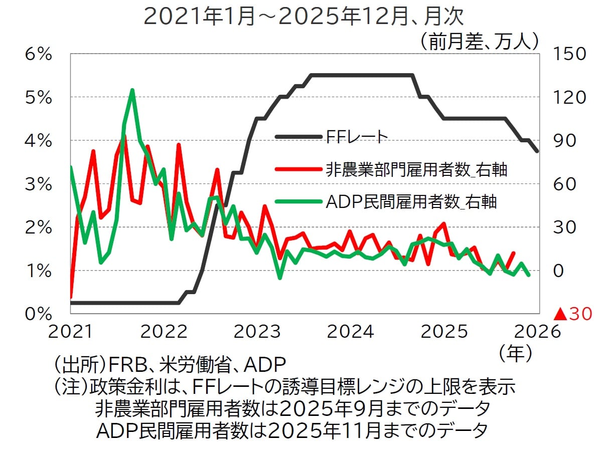 [図表1]政策金利と失業率の推移 出所:FRB、米労働省、ADP(注)政策金利は、FFレートの誘導目標レンジの上限を表示