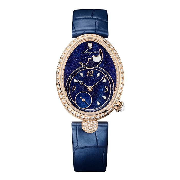 月のパワーを宿した新作は、48粒の厳選されたサファイアをベゼルにあしらって。幻想的な天空を想起させるブルーのフェイスには、14粒のダイヤモンドのインデックスがきらめきを添える。