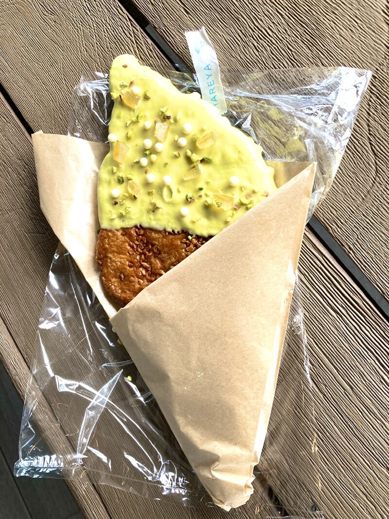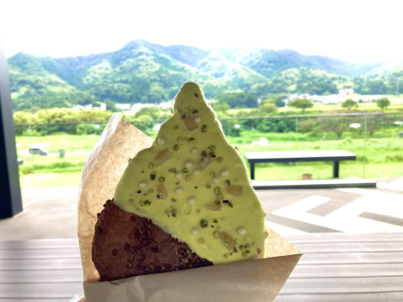 酒店前のテラス席で、クルンジをイートインしました。目の前に九頭竜川と里山が見えて、心地よい風に吹かれながら頂くと、とても爽快な気分になれます。クルンジはサクサクのパイみたいで、クロワッサンとは別物に変化しています。トッピングはレモンピールとピスタチオがトッピングされたレモンチョコがかかっています。