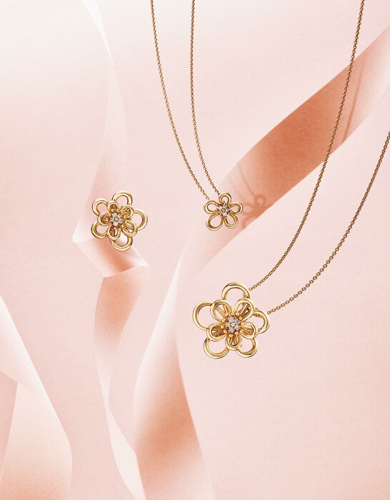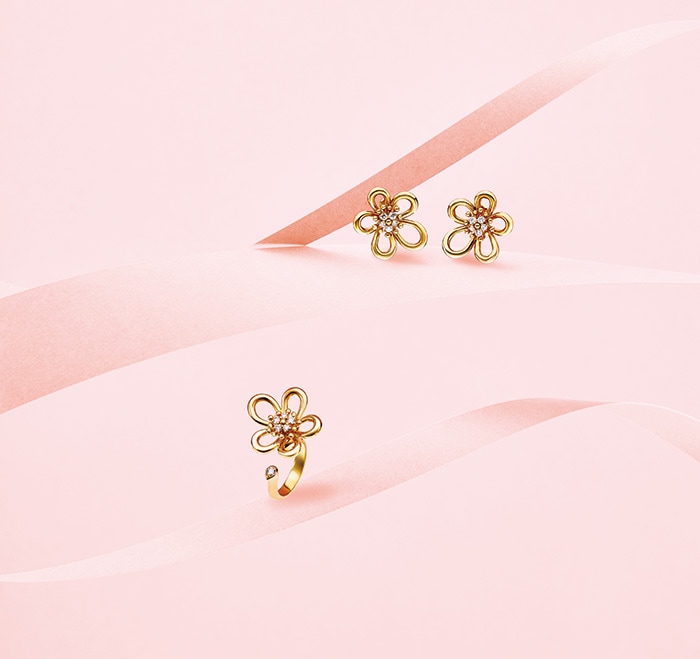 花冠の輪郭が立体的に浮かび上がる躍動感のあるデザイン。アシンメトリーな大小の花びらをイエローゴールドのオープンワークで表現して。