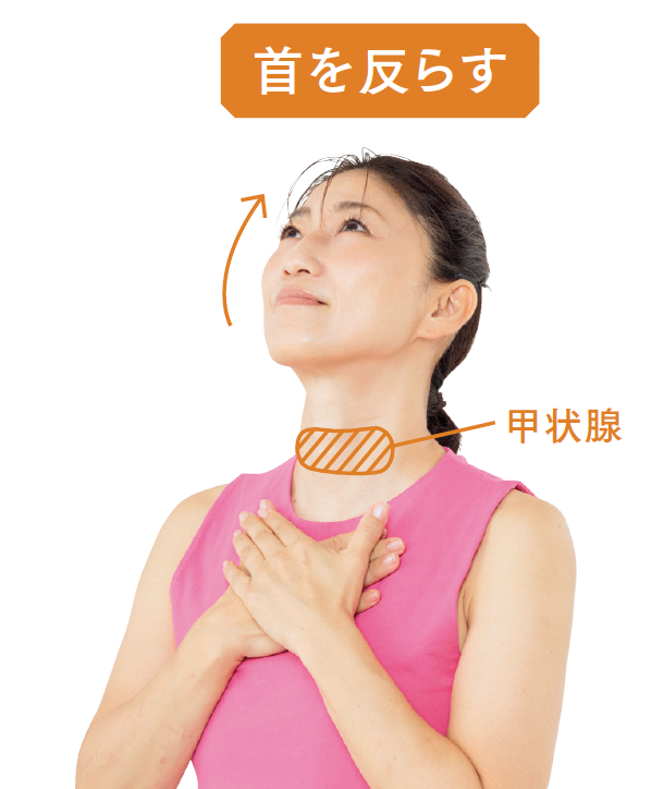 甲状腺はのどぼとけの下にあるので、首が気持ちよく伸びる位置まで反らし、胸に手を当てゆっくりと呼吸を繰り返しましょう。