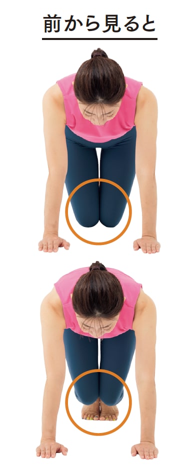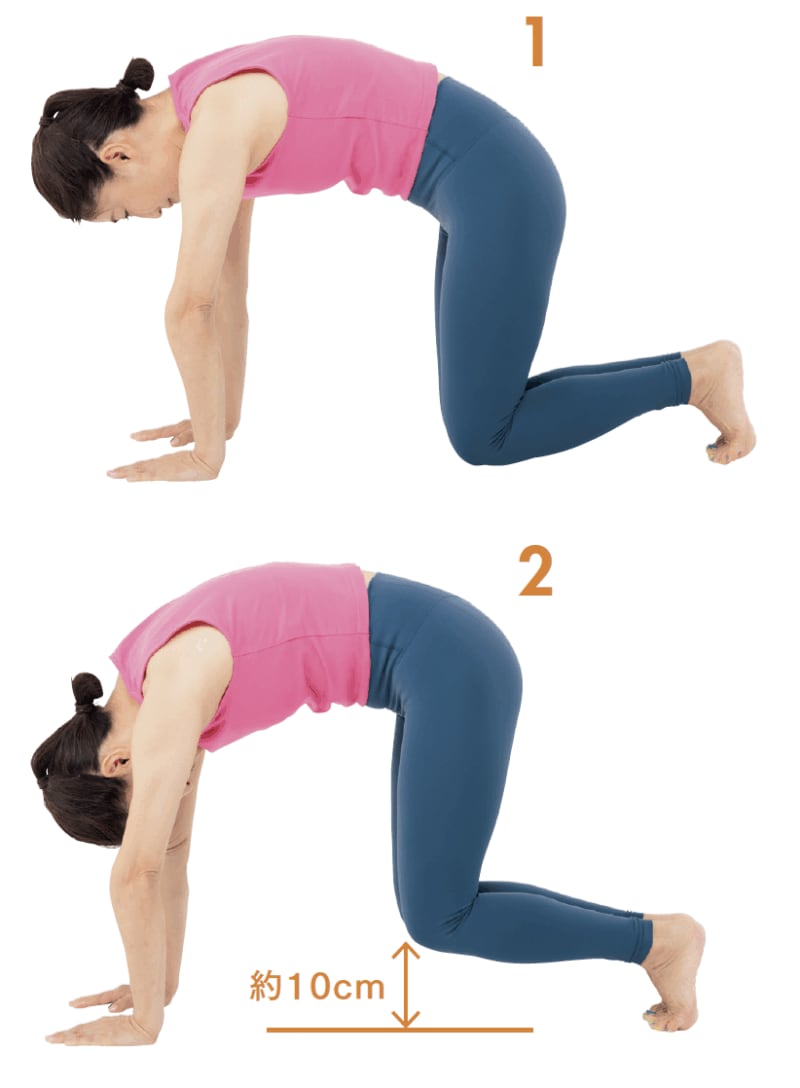 1. 両膝をつけ、腕は肩幅に広げ、四つん這いになります。足はつま先立ちにして、背中は丸く。