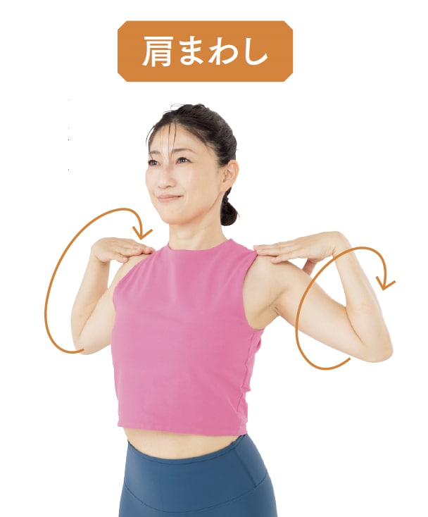 肩に手を置き(難しい場合、肩から手を離した状態でもOK)、肩甲骨を意識しながら大きく後ろに向かって肩をまわします。