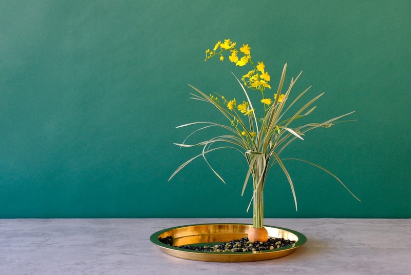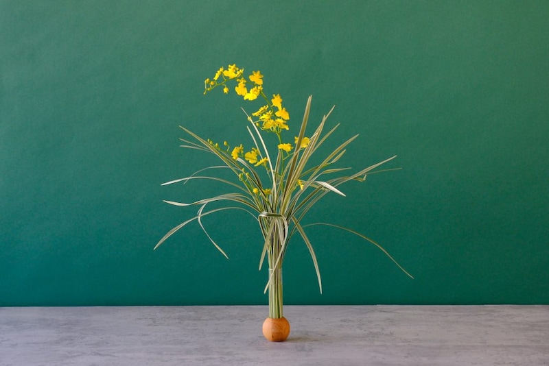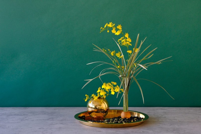 ここでは、斑のない鮮やかな黄色のオンシジウムを選び、金色の花器に生けました。一種類の花だけでも、空間に飛び切りの華やぎを添える花あしらいです。