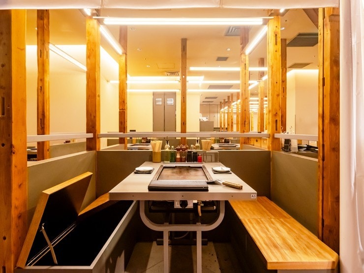 店内には鉄板を設置したテーブル席を多数用意。一人でもグループでも気軽に立ち寄れる雰囲気です。未就学児はソフトドリンクが無料だったり、小学生までならおもちゃのプレゼントがあったりと、子ども連れのファミリーにうれしい特典が充実。本場の味が体験できるので、まだもんじゃ焼きを食べたことがない人にもぜひ味わってほしい一軒です。