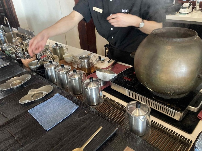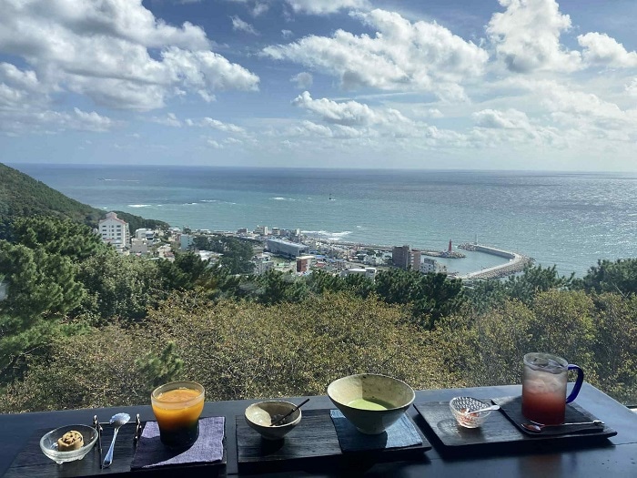 韓国を代表する美しいビーチリゾートで、広大な白砂のビーチが有名な釜山・海雲台の高台に佇(たたず)む「BibibiDang」は、海と街並みを一望する特別なティーハウス。中心地からタクシーを利用すると20分ほどで着く。店に入り、大きな窓から広がるのは、青い海とゆるやかに弧を描く海雲台ビーチ。その絶景を前にいただく伝統茶や発酵茶。深い旨みとすっきりとした香りが特徴で癖がなく飲みやすいものが多い。ナツメ茶や抹茶などもいただくことができる。店員が一杯一杯丁寧に時間をかけて釜のお湯を使って、抽出するお茶は、心身の緊張をそっとほぐしてくれる。