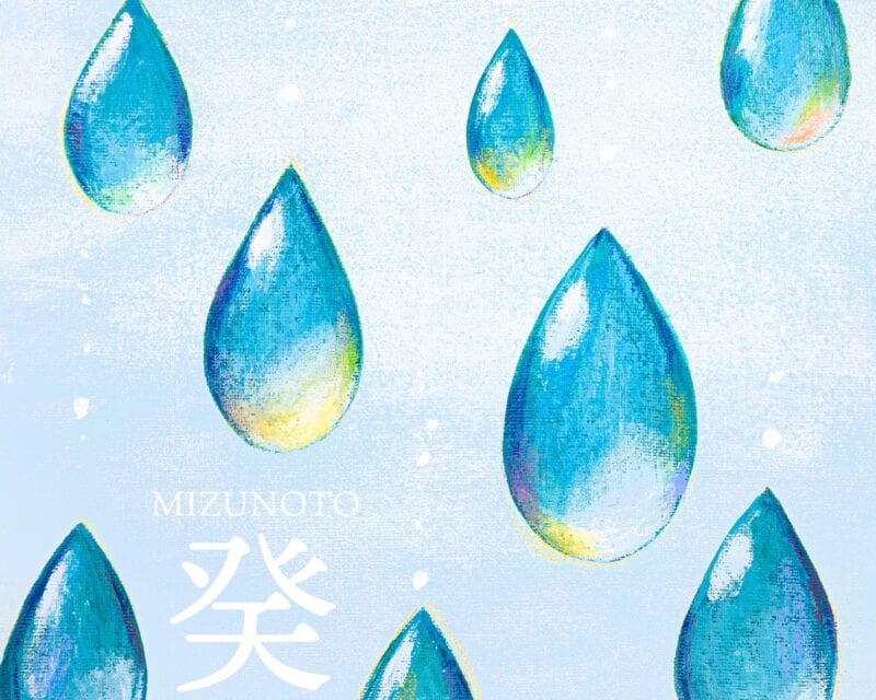 癸は、陰の「水」の象意であり、雨のように降り注いでいる状態。雨は、たとえ一粒は小さくても、地表に降り注いで川や湖に流れ、それらがやがて植物などの生物の成長を促します。また、時間をかけて地面の形を変え山や谷、川を生み出します。癸を命式に持つ人は、感情に敏感で、芸術や創作活動を好みます。繊細な感性を持ち、内面世界が豊かで、他人に対しても共感的。変化に抗わず、流れに身を任せますが、ときに細部にこだわる一面も。