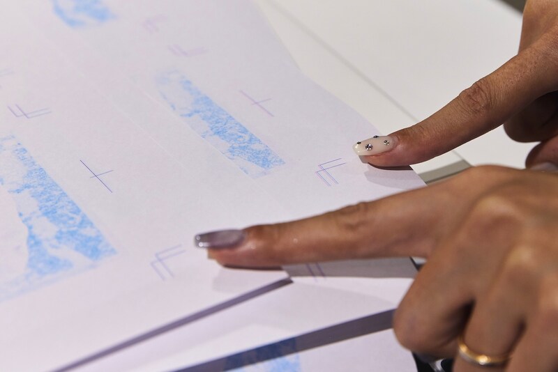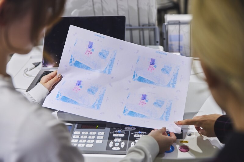 一色ごとに試し刷りをして印刷位置を確認。微妙なズレを少しずつ修正する作業も、リソグラフならではだ。コンマ数ミリ単位で調整を行うが、100%一致させることは難しい。