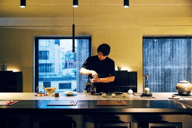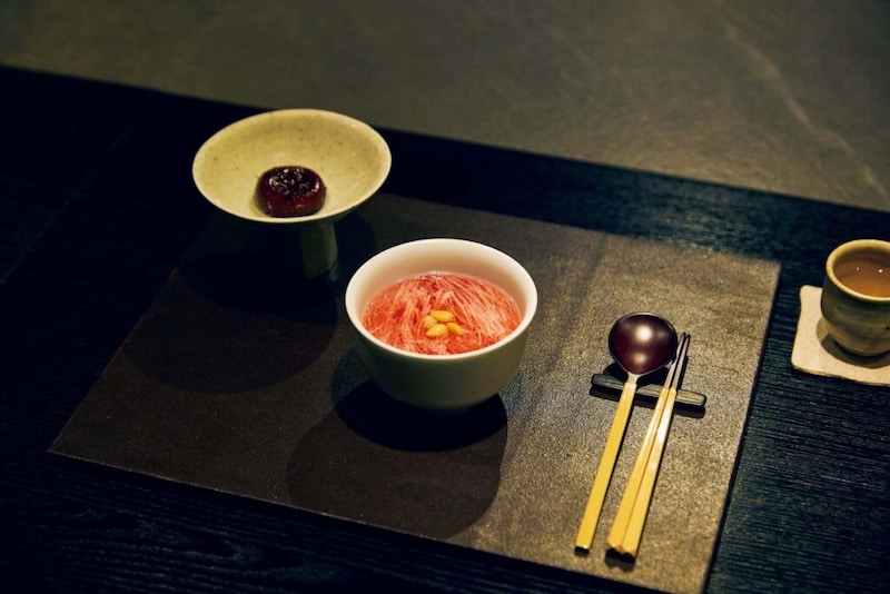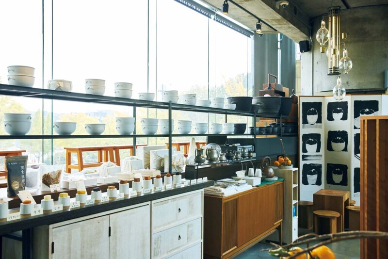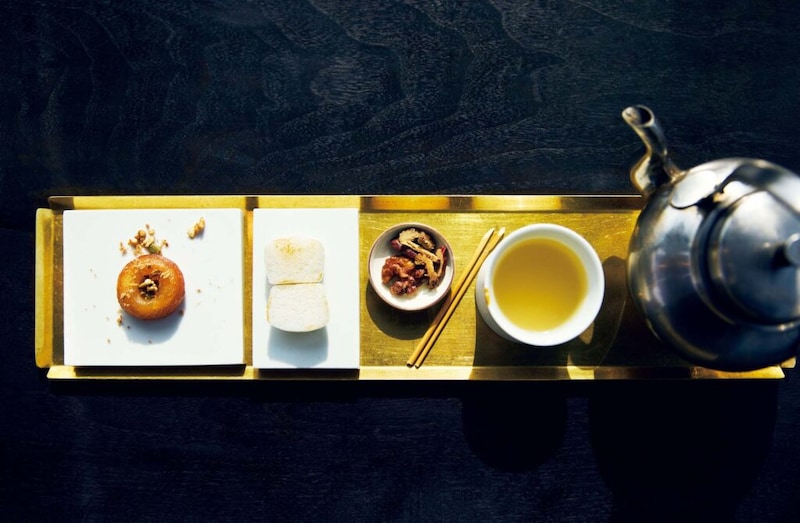 「餅への理解と繊細な技、節気にちなんだ茶菓(タグァ)と茶の組み合わせ、実家も餅店というオーナーのイ・ミョンジェさんのセンスの良さに驚きます」。オリジナル茶は季節ごとに替わり、冬は風邪予防にも作用する河東地域の緑茶を発酵させた茶に、済州島のミカンの皮、生姜などをブレンド。6品ほどの茶菓子が出る80分コースのみ。