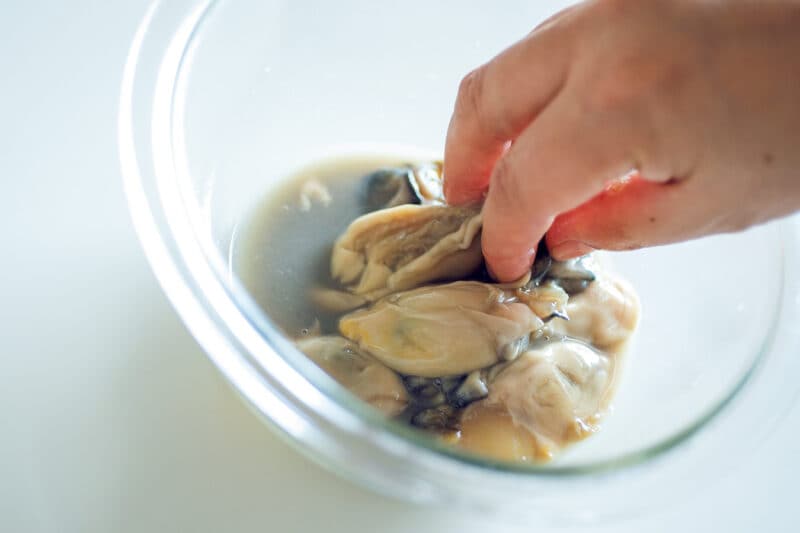 1. 牡蠣はボウルに入れたら粗塩をふり、水(分量外)でよく洗う。水気を拭き、牡蠣一粒ずつに小麦粉を軽くまぶす。