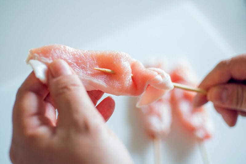 1. 豚肉は横半分に折りたたみ、縫うようにして竹串に刺す。